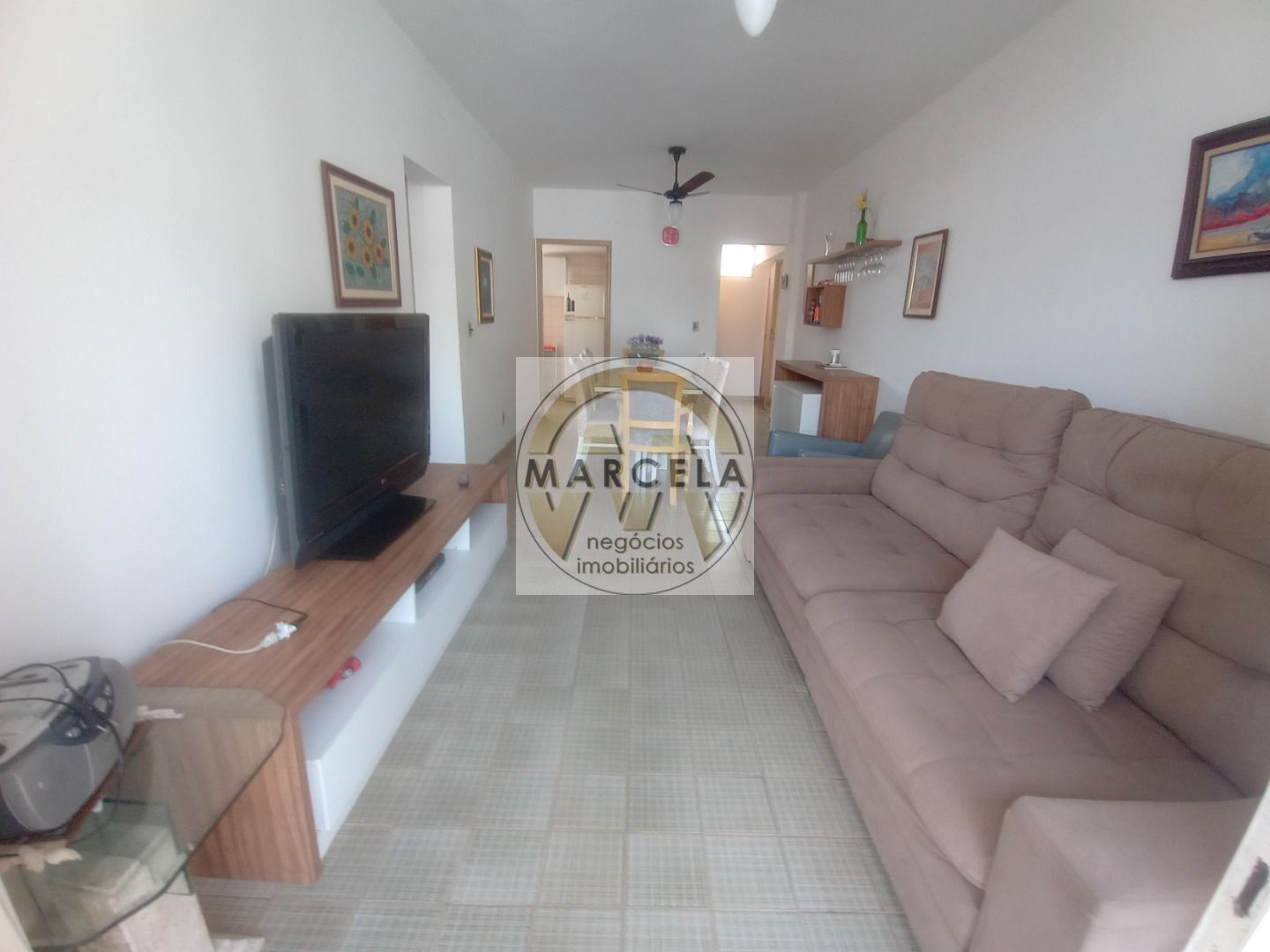 Praia da Enseada região do Tortugas, apartamento mobiliado com 02 dormitórios, banheiro social, sala para 02 ambientes com sacada, lavabo, cozinha, área de serviço e 01 vaga de garagem.Prédio com zelador e elevador.300 mts da praia.