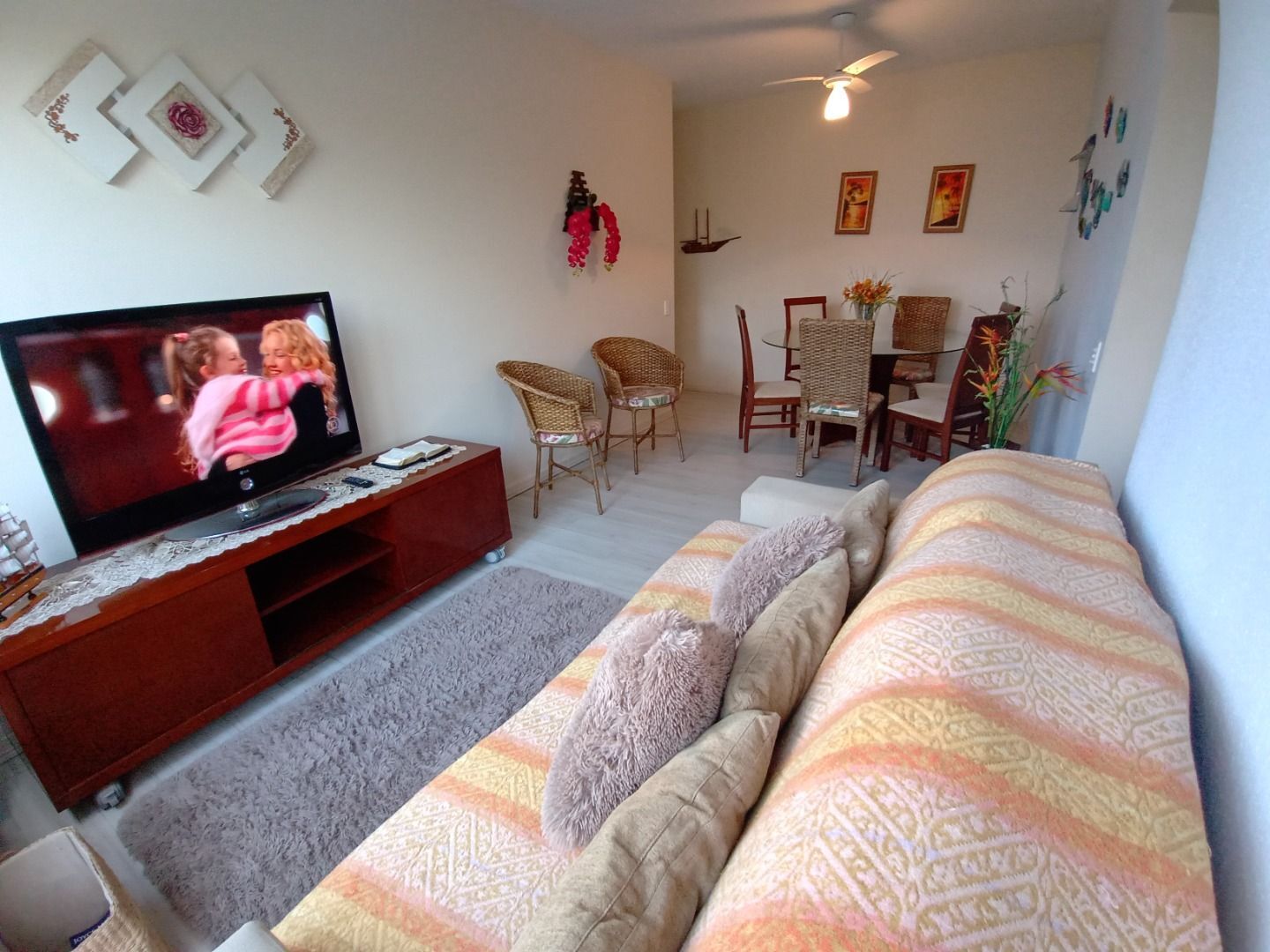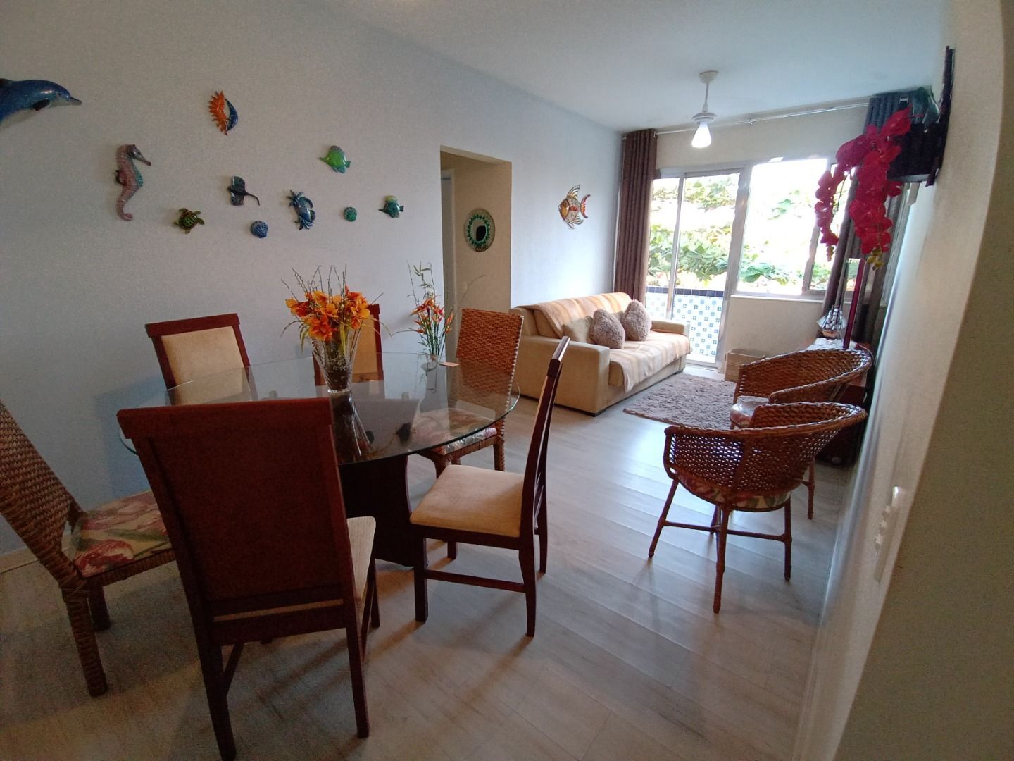 Praia da Enseada, apartamento reformado e mobiliado com 02 dormitórios, sala para 02 ambientes com sacada, banheiro social, cozinha, área de serviço, dependência de empregada com wc e 01 vaga de garagem.Prédio com churrasqueira. e sem elevador.200 mts da praia