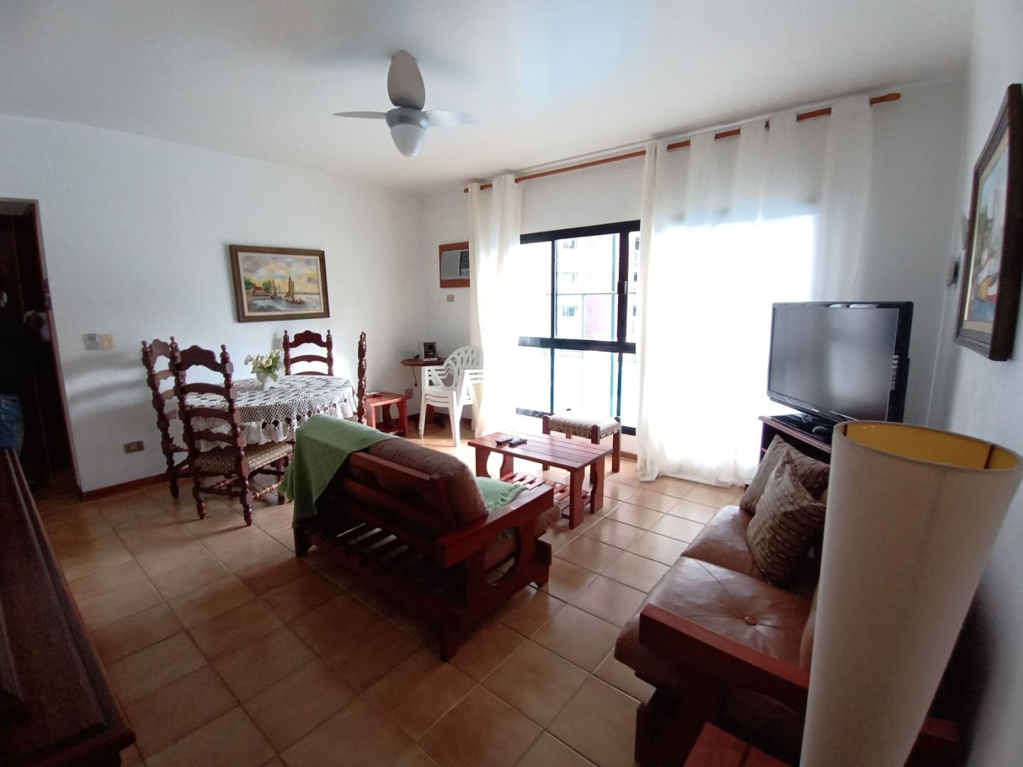 Enseada lado praia, apartamento mobiliado com 02 dormitórios (01 suíte com sacada), sala para 02 ambientes, banheiro social, cozinha, área de serviço com wc e 01 vaga da garagem.Prédio com zelador, elevador e churrasqueira.