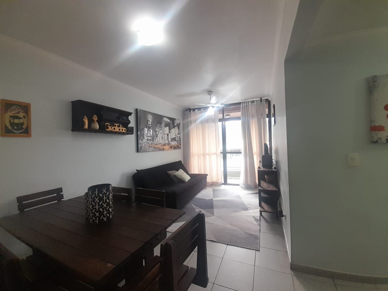 Sala ampla para dois ambientes com sacada.02 dormitórios com armários embutidos e ventilador de teto e wc social.Cozinha com armários, área de serviço e wc de serviço.Condomínio com: piscina, churrasqueira, salão de festas, elevador, portão eletrônico.Região com comércio variado com lojas, supermercados, restaurantes, farmácias e muito mais.Tratar com corretora Cristina (13) 9-9793-9848
