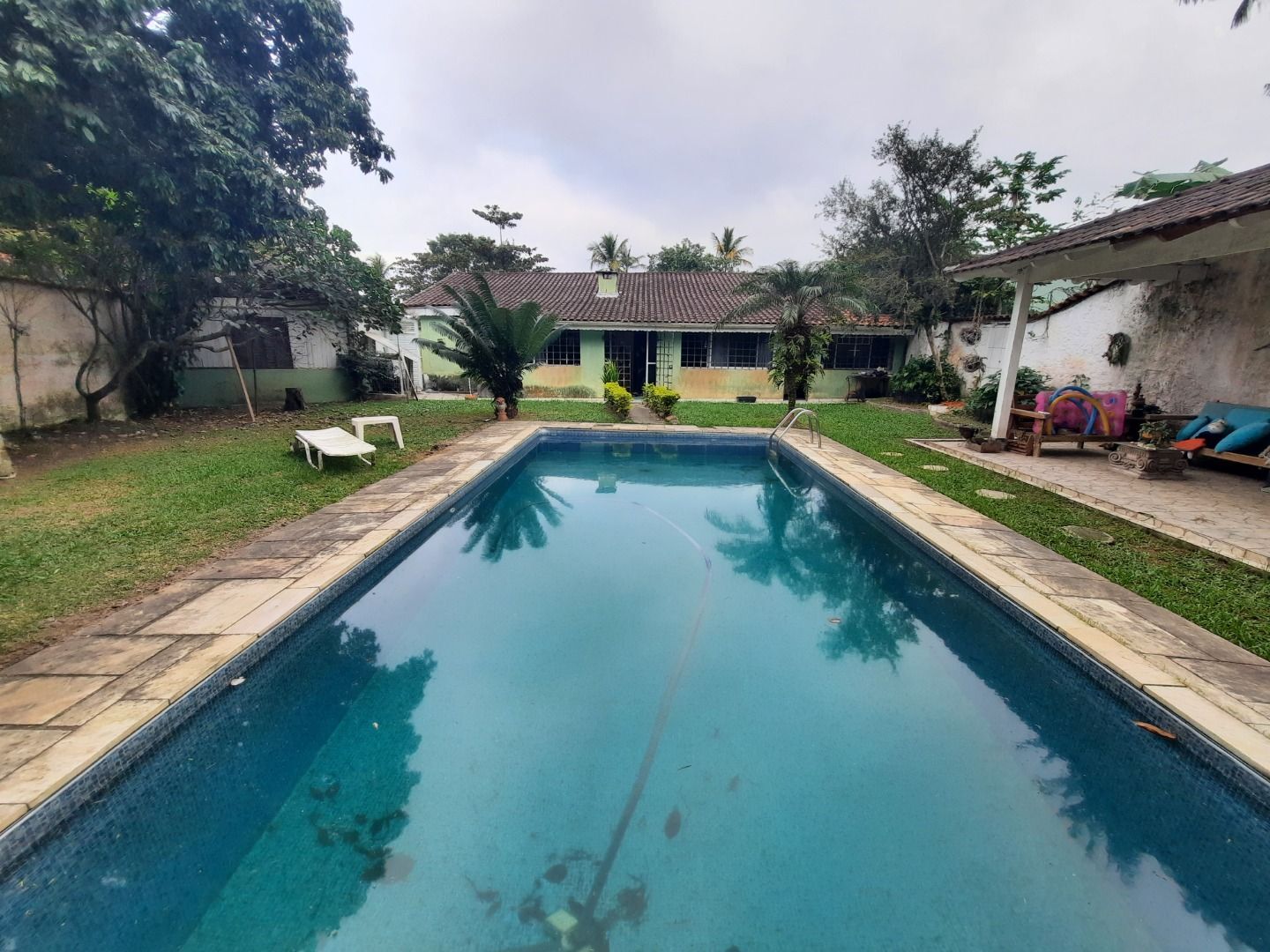 Casa térrea á venda - Jardim Virgínia lado praia, sala 3 ambientes, varanda, mobiliada, 3 dormitórios sendo 1 suíte, , cozinha planejada com armários, despensa, quintal, piscina, churrasqueira, jardim, ducha, deposito,dependência de empregado, área de serviço e 4 vagas de garagem.