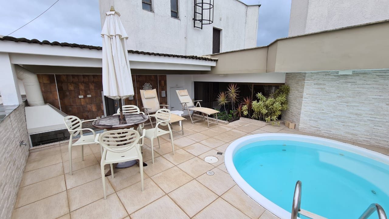 Praia da Enseada, cobertura duplex com 03 dormitórios (02 suítes), ar condicionado, armários, 02 salas com sacadas, banheiro social, cozinha, área de serviço, terraço com vista para o mar, piscina, churrasqueira e 02 vagas de garagem.