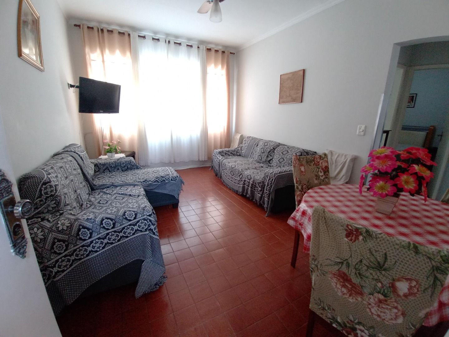 Praia da Enseada, apartamento mobiliado com 02 dormitórios, sala, banheiro social, cozinha, área de serviço com wc e 01 vaga de garagem.Prédio com zelador, box individual e sem elevador.